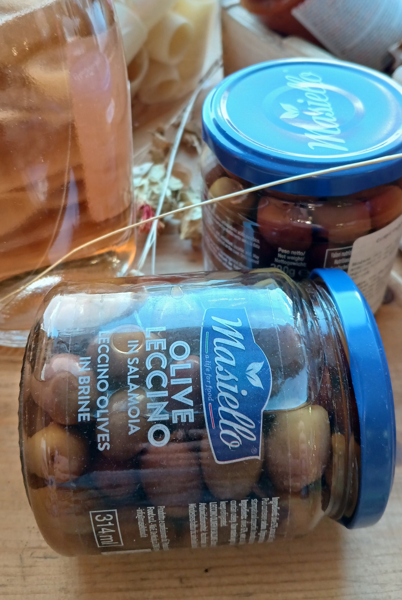 Olivy plněné mandlemi, v nálevu ze slunečnicového oleje, koření a soli. Mají slano-ovocnou chuť a šťavnatou strukturu. Hodí se jen tak k vínu nebo šampaňskému, do koktejlů, k rybám, nebo jako součást tapas. Mandle v olivách jsou křehké, křupavé.
