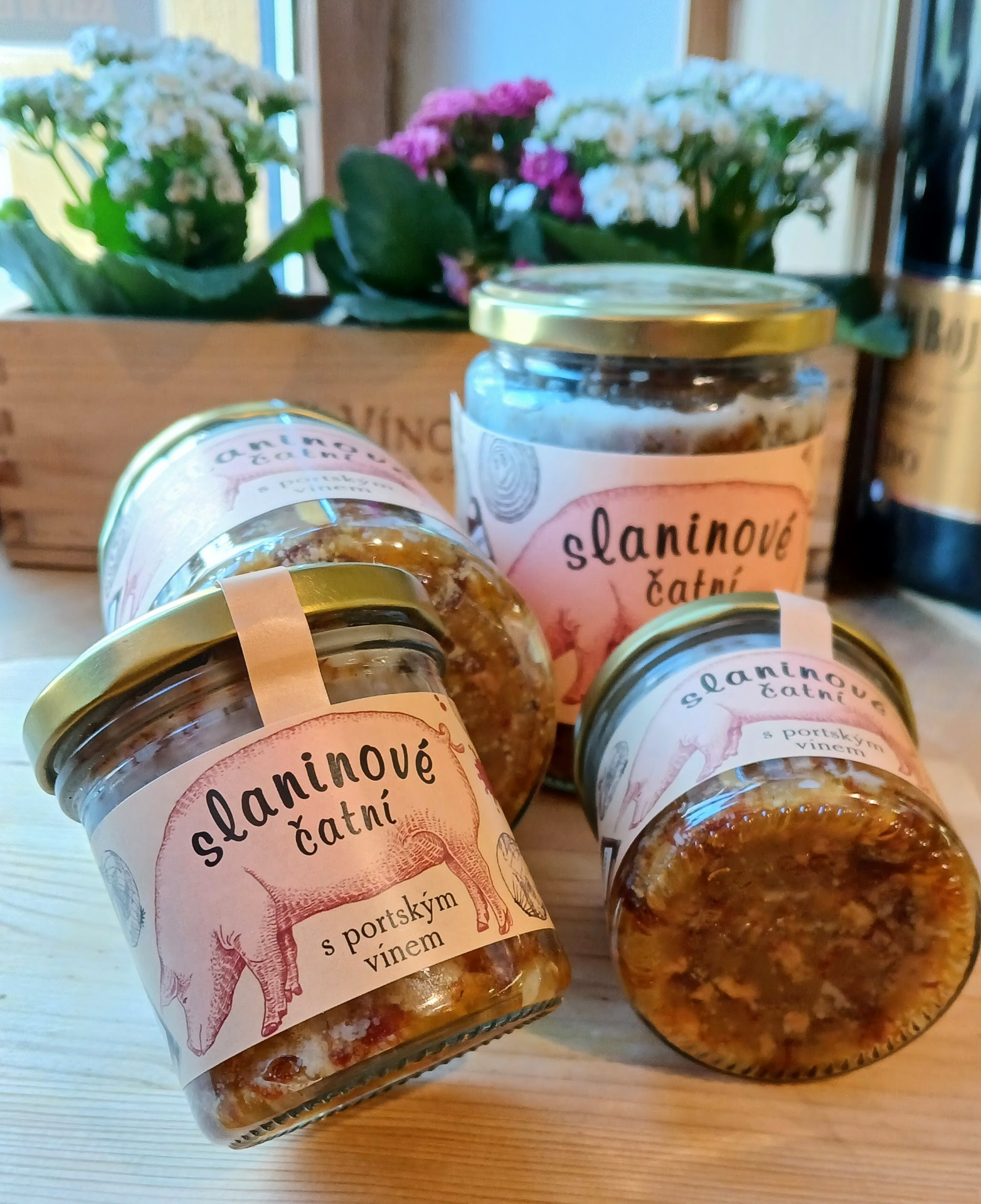 Uzená slaninka, připravená spolu s portským vínem, cibulkou a jablečným octem na způsob čatní, se kterým lze v kuchyni kouzlit. Chutná samotné s opečeným pečivem, ale i v teplé kuchyni například k bramborám, do těstovin, omáček nebo k nokům. Vyrobeno v České republice.